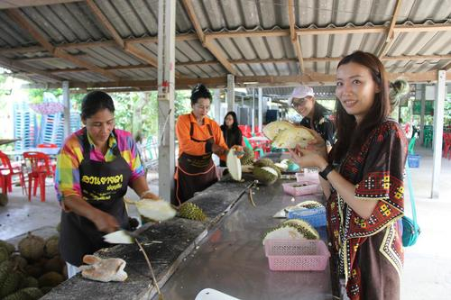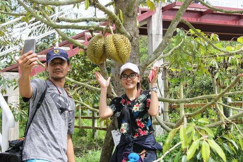 罗勇府亚达果园种植的优质榴莲吸引很多游客留影。孙广勇摄