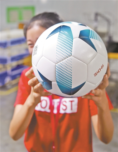 很多足球的球面上有各种各样的图案。有了球片之后,第二步就是给球片喷上颜色。“以前是丝网印刷,印色有10个步骤,而现在我们用的是数码打印,就跟家里自己在打印机上打印一样”。球片大小接近,颜色类似,人工识别难度很大,费时费力。如何解决这个问题?在这条生产线上,第三个工序就是给所有的球片打上二维码,球片有了自己的“身份证”。“机器可以识别这些二维码,知道这个球片是做什么的,是哪个球的,球片有问题,我们可以追溯到是哪个足球”。
