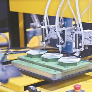东莞硕科塑胶五金制品有限公司是国内顶尖的足球制造企业,据该公司负责人王冲介绍,全世界的足球基本都是在中国生产的,而过去生产足球大部分工序是靠人手完成,100个人工作10个小时才能生产1000个足球。去年12月底,硕科在由世界顶尖的机器人专家学者创立的东莞市李群自动化技术有限公司帮助下,设计了国内首条足球自动化生产线,实现“机器换人”,足球生产效率提高了10倍,现在不到10个人就能完成过去100个人的工作量。