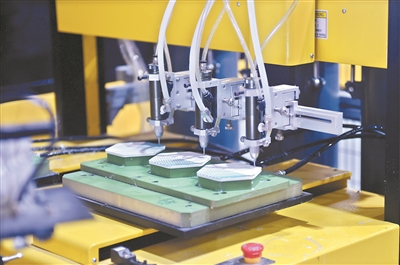 这时,球片马上就要来到整条自动化生产线最核心的地方。王冲说,“1个小时可能有上千个球片在生产线里跑,这个球片是做哪个球的,如果要靠人来识别,那就太慢太难了,球片上的二维码的作用就在这里。机器读取二维码,就能准确地把不同的球片放到不同的位置”。