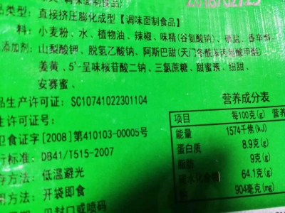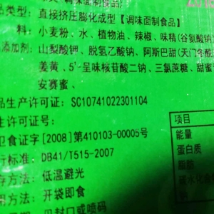 记者随机购买了两包辣条,每包不到1块钱,商品名称分别为“香嘴棒”“绿爽”。翻看配料表,主要配料分别是小麦粉和水,除此之外都是调味料和食品添加剂。“植物油、辣椒、味精、碘盐、香辛料”“山梨酸钾、脱氢乙酸钠、阿斯巴甜、姜黄、5'-呈味核苷酸二钠、三氯蔗糖、甜蜜素、纽甜、安赛蜜”。记者数了一下,两款辣条里面,除了小麦粉和水,都含有5种调味料,9种食品添加剂。