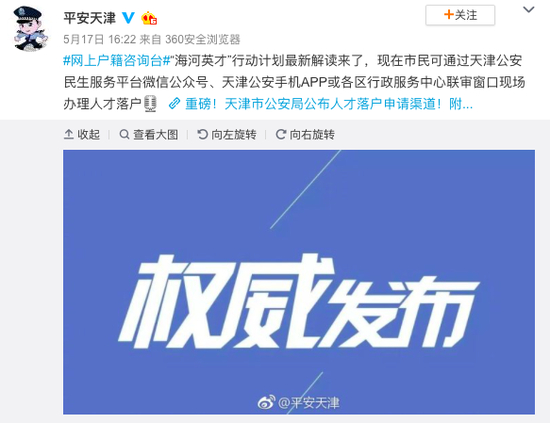 夜里12点多回到宾馆,他在微博上晒出了自己拿到的准迁证,还为一直加班到深夜的天津公务员点赞。一位天津网友回复:“希望你们能在天津工作,为天津尽一份力,也不枉费天津对你们的期待和支持。”