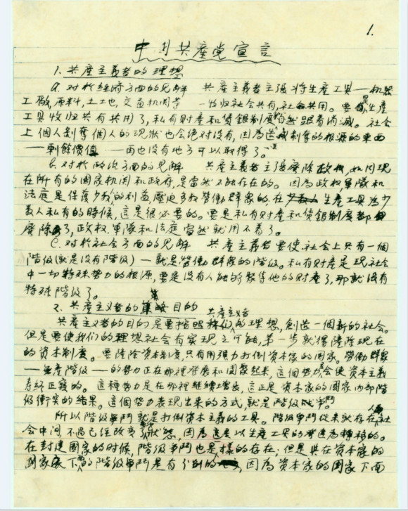 1920年11月,上海的共产党早期组织起草的《中国共产党宣言》。宣言分为三部分:“共产主义者的理想”,“共产主义者的目的”和“阶级斗争的最近状态”,明确地提出,要依靠工农群众进行无产阶级革命,要建立无产阶级专政。