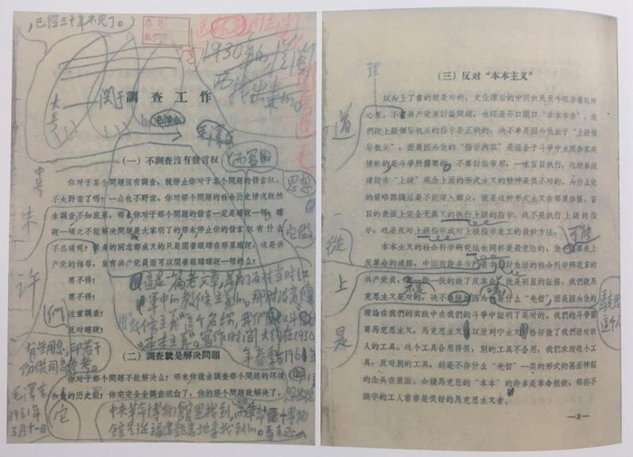 况。”这篇重要文献体现出党的实事求是、群众路线、独立自主三个原则已具维形。图为1961年3月11日,毛泽东对《调查工作》的批注和修改稿(部分)。