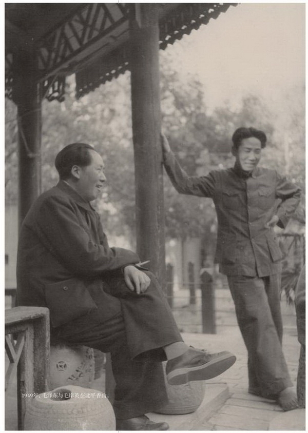 1949年,毛泽东与毛岸英在北平香山。