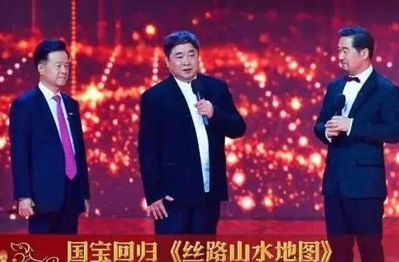 狗年春晚,单霁翔穿立领白褂、黑色中式外衣站在舞台中央,介绍明《丝路山水地图》坎坷回归路,台风稳健。