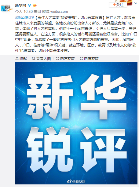 #新华锐评#[留住人才需要“软硬兼施”,切忌舍本逐末]留住人才,就是留住城市未来发展的希望。各地政府纷纷出台人才新政,尤其是放宽落户政策,体现了对人才的重视。但对于一个城市来说,引进人只是第一步,关键还得要留住人。在这方面,很多抢人的城市可能还没有做好准备。比如“户口空挂”现象,就暴露了一些地方在吸引人才政策方面的短板。因此,城市留人,户口、住房等“硬件”很关键,就业环境、医疗、教育以及城市文化等“软件”也很重要。切记不能舍本逐末。