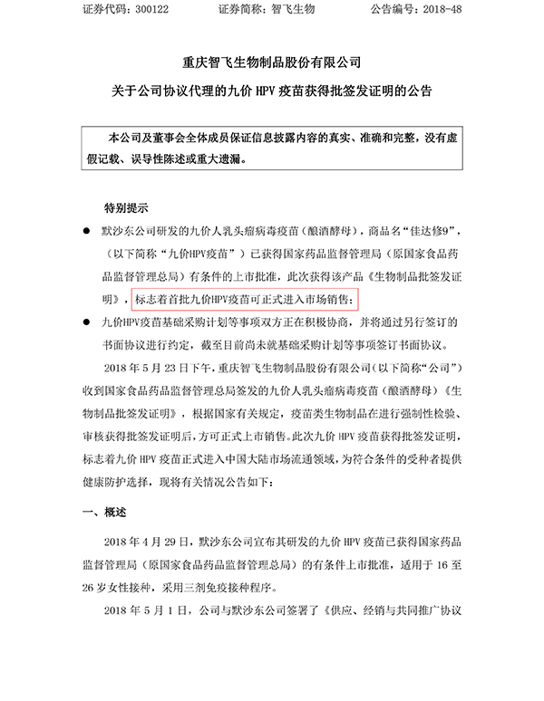 原标题:智飞生物:九价HPV疫苗获批签发证明,可正式进入市场销售