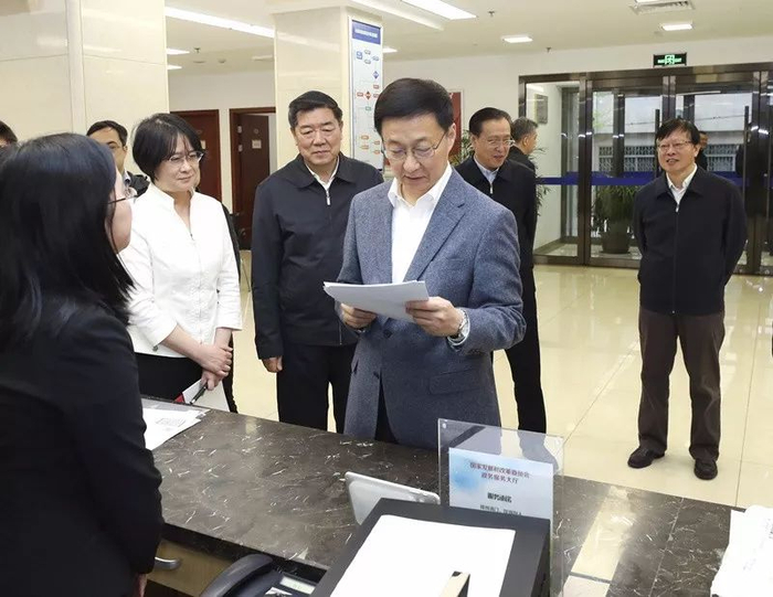 4月3日,中共中央政治局常委、国务院副总理韩正到国家发展改革委调研并主持召开座谈会。这是韩正在国家发展改革委政务服务大厅考察。右一为丁学东。来源:新华社