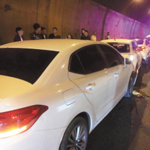 民警继续驾车缓慢前行了几百米后,发现在前方隧道左侧道路上,发生了多辆小车相互追尾撞在一起的交通事故。