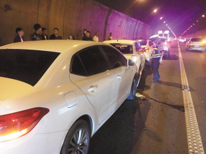 经民警询问,发生事故的最后那辆车的驾驶员称,刚才自己驾车驶进隧道后,因为车速较快,距离前车又较近,等行驶了一段距离后,突然发现前车减速慢了下来,这时再想减速已经来不及了,一下就撞了上去,追尾了前面的一辆白色轿车。然后惯性又导致这辆白色轿车再追尾它前面的其它轿车,由此造成了这五辆当时相互距离较近的小车发生连环相撞。其中最后那辆白色小车的前保险杠,和它前面那辆白色轿车的后保险杠及后窗玻璃等部位受损严重。另外的三辆车也有不同程度的损伤,好在事故没有造成人员受伤。