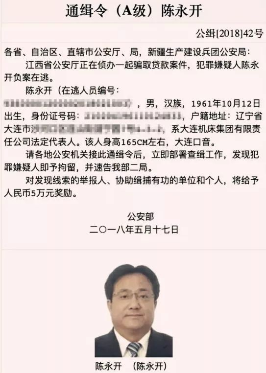 原标题:大连机床董事长陈永开涉嫌骗贷数亿元,公安部发出A级通缉令