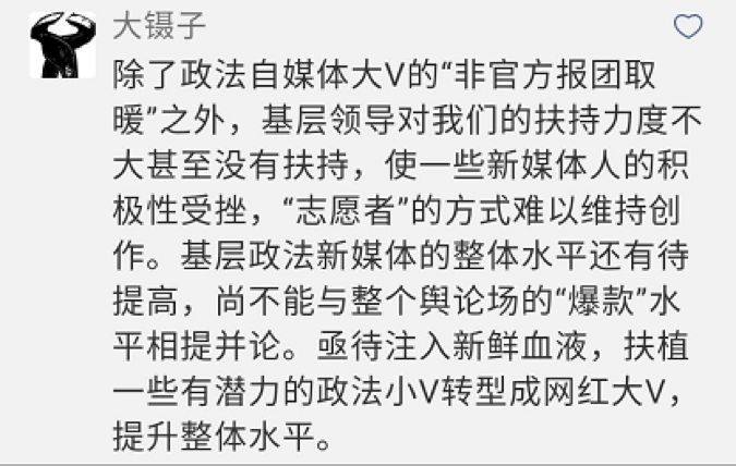有基层领导不仅不重视体制外“大V”,也不注重重用政法系统内“大V”,这种僵化思想,导致了人才的流失。