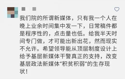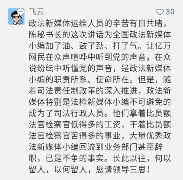 这也引起了政法君们关于“人才”的一场大讨论:新媒体工作没有白天黑夜,累、苦、责任大,很多人不愿干。
