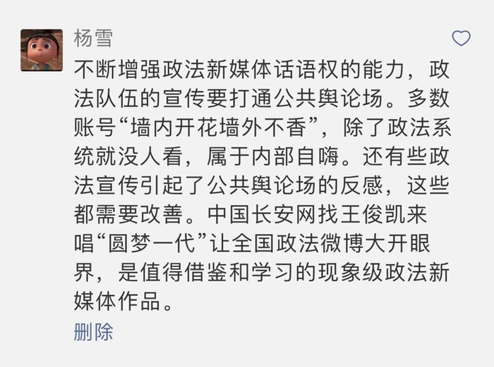 有小伙伴提出,政法系统多数账号“墙内开花墙外不香”,除了政法系统就没人看,属于内部自嗨。甚至有些政法宣传引起了公共舆论场的反感,这些都需要改善。而长安剑起到了打通两个舆论场的作用,应该多向他们学习!