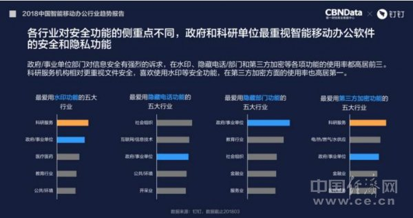 不过各行业对安全功能的侧重点有所区别,最重视移动办公软件的安全和隐私功能的莫过于政府和科研单位。其中政府/事业单位部门在水印、隐藏电话、隐藏部门和第三方加密等各项功能的使用率都位居前三。科研服务机构相对更喜欢使用水印、第三方加密等安全功能。
