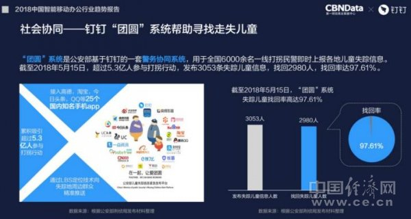 除了绿色环保,智能移动办公企业还在致力于提高社会协同效率。比如公安部基于钉钉打造的警务协同系统“团圆”,旨在通过让全国各地打拐民警第一时间上传失踪儿童信息,并通过新媒体及时推送给周边群众的方式,实现警民联动快速寻找和侦破案件。截至2018年5月15日,团圆系统共发布失踪儿童信息3053条,找回2980人,找回率为97.6%。
