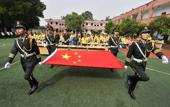 看那整齐的步伐,听那嘹亮的口号声,注视着重庆邮电大学升旗队,孩子们齐刷刷地高高举起手臂,以最标准的少先队队礼参加升旗仪式。