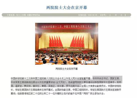 一直到2006年6月5日,中科院第十三次院士大会、中国工程院第八次院士大会开幕,那次会议,十六届中央政治局的9位常委全员出席。
