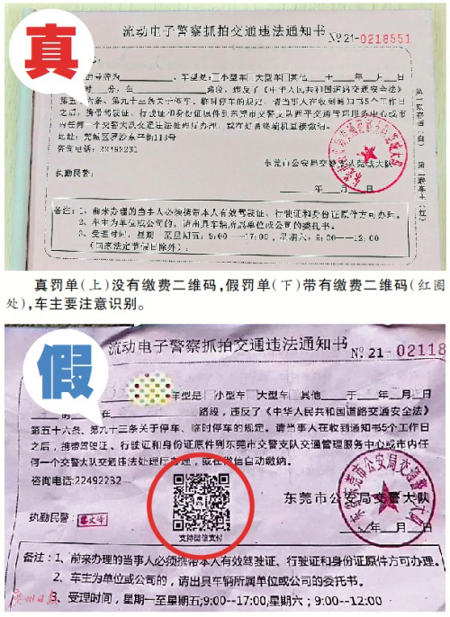 大洋网讯 昨日,有东莞市民收到一张高仿交通罚单,上面还有“交罚款”的二维码,所幸该市民很快识破了骗局。东莞警方昨晚通报,3名嫌疑人已被刑拘。