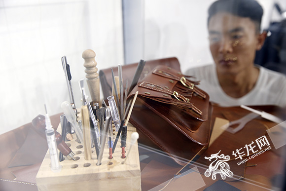 大学生展示自己手工打磨制成的复古机车专用皮具。记者 李文科 摄