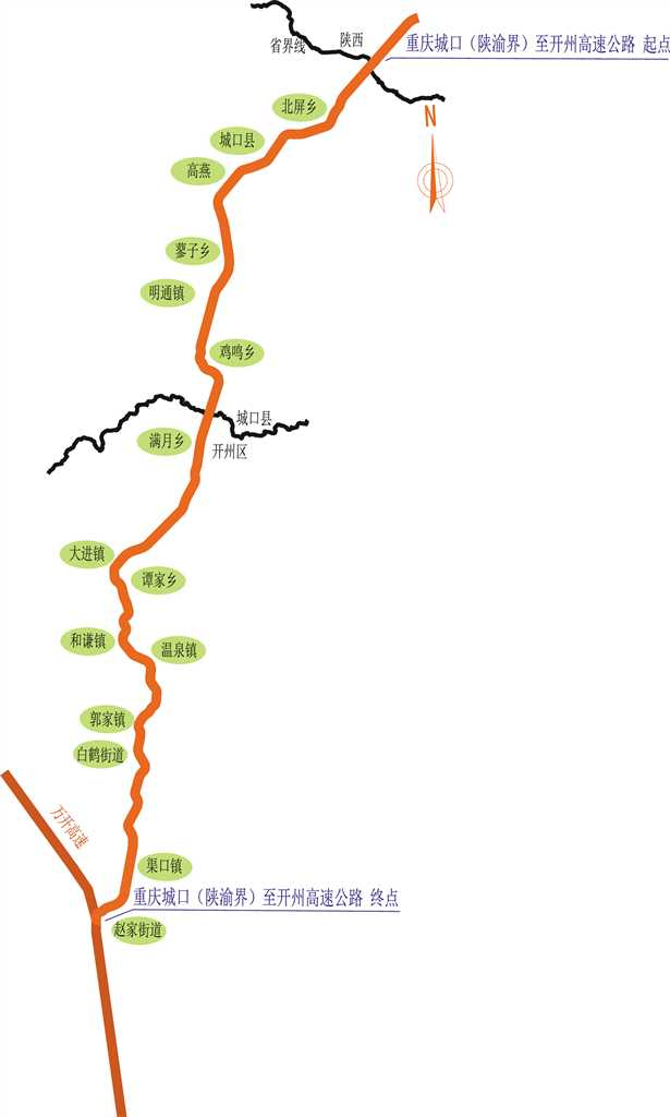 据城开高速建设业主——重庆高速工程顾问有限公司介绍,城开高速北接拟建的陕西安康至岚皋高速公路,为国家高速公路G69银(宁夏银川)百(广西百色)高速的一段。城开高速起于大巴山陕渝界(设纵贯陕渝的大巴山隧道),经城口县北屏、县城、蓼子、鸡鸣,穿雪宝山(设城开隧道),再经开州区满月、大进、温泉、白鹤、渠口,接万(州)开(州)高速公路。