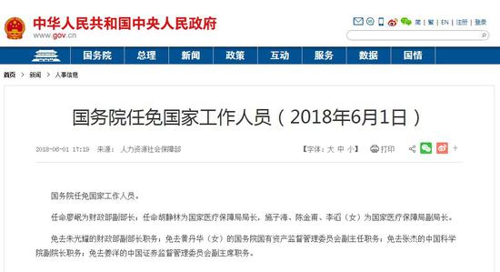 和廖岷同日被任命的胡静林,此前是财政部副部长。这是财政部“输出”的一位官员,他成为机构改革后新组建的国家医疗保障局的首任局长。(高语阳)