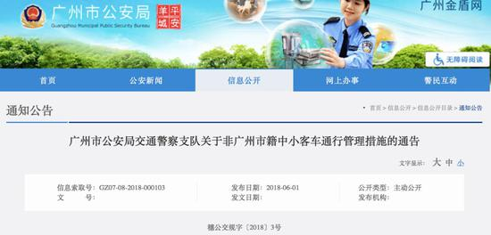 6月1日,广州市公安局交通警察支队发布了一份《关于非广州市籍中小客车通行管理措施的通告》:广州市部分区域将实施非广州市籍中小客车通行管理措施。
