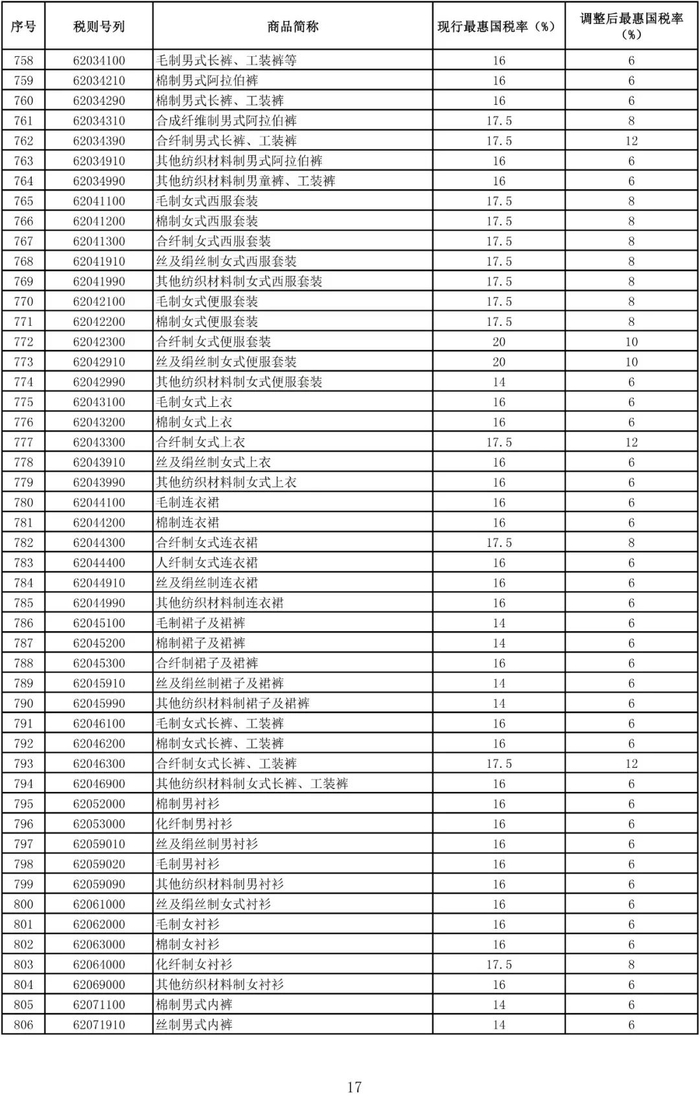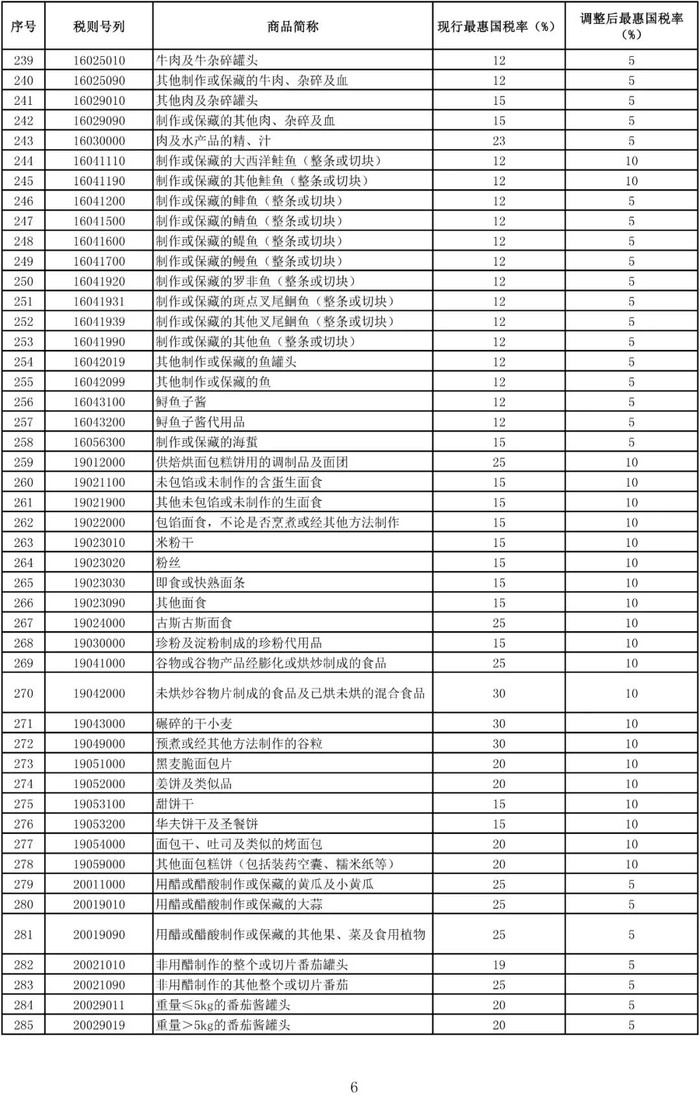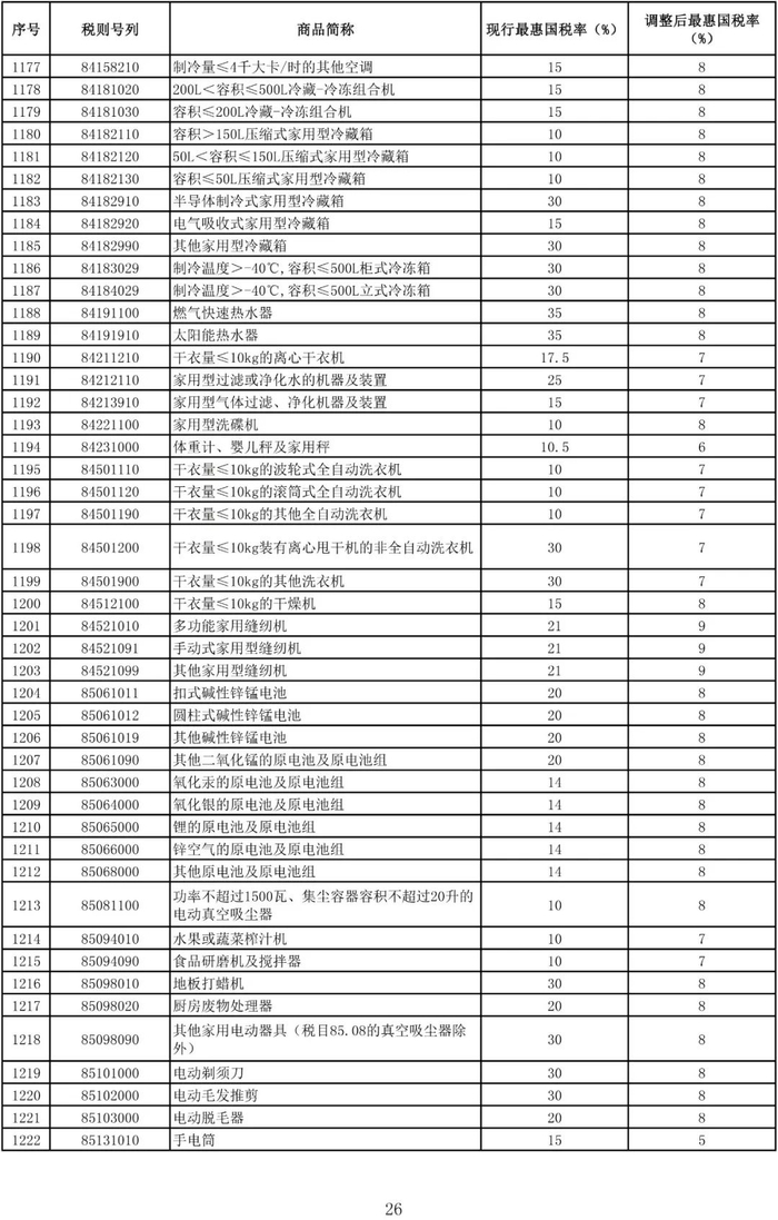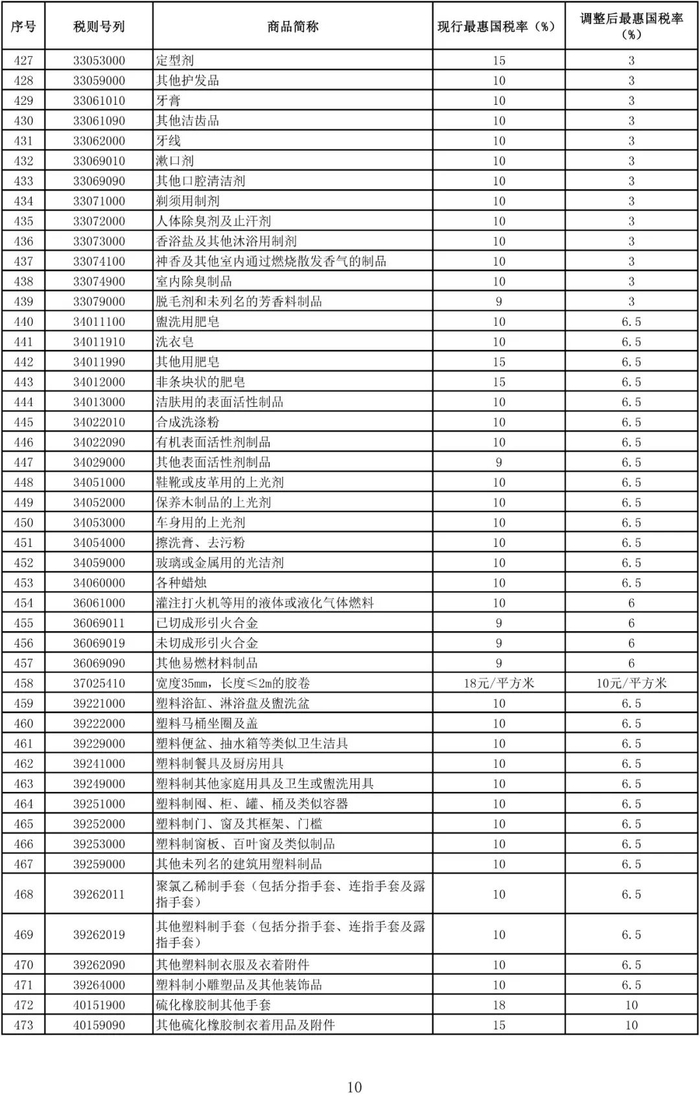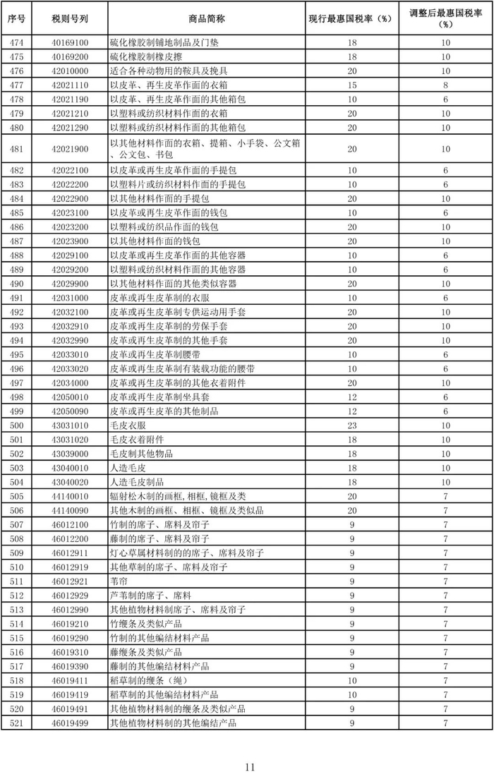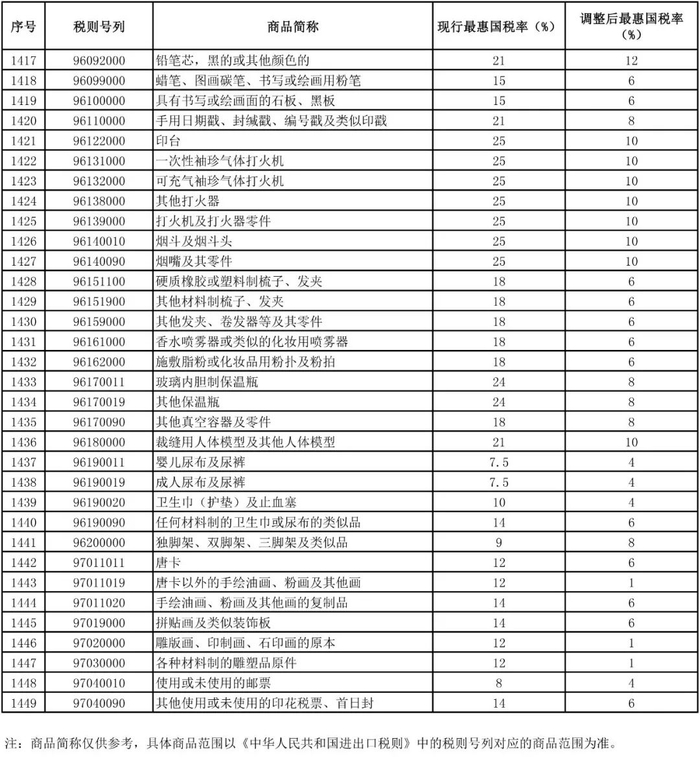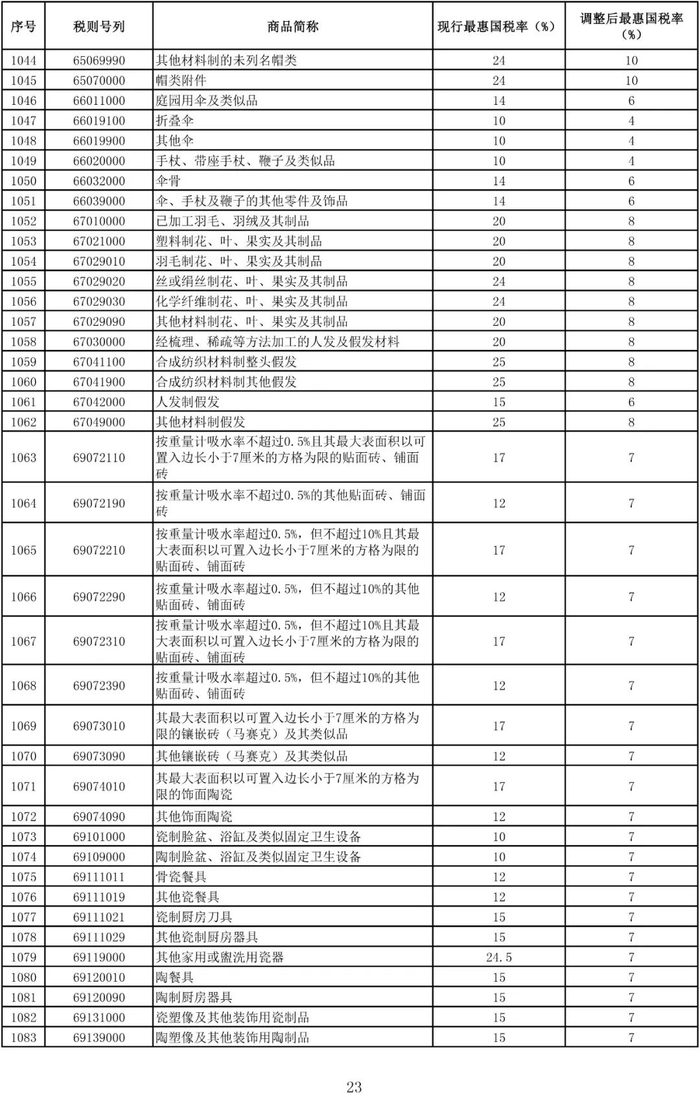 进口日用消费品最惠国税率调整表