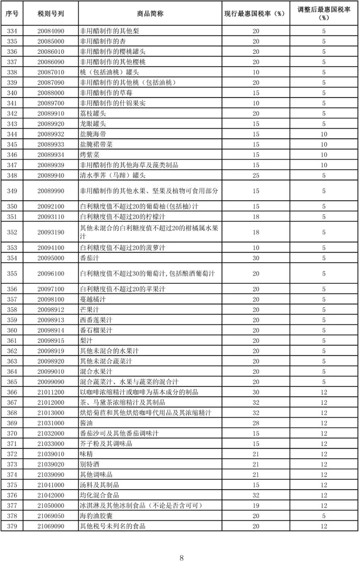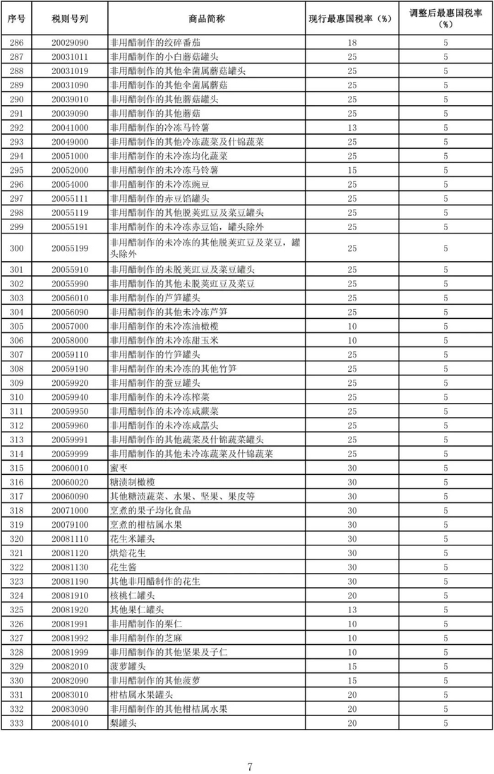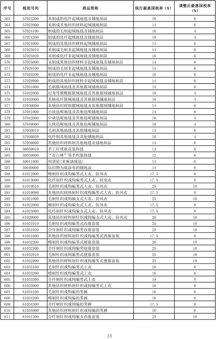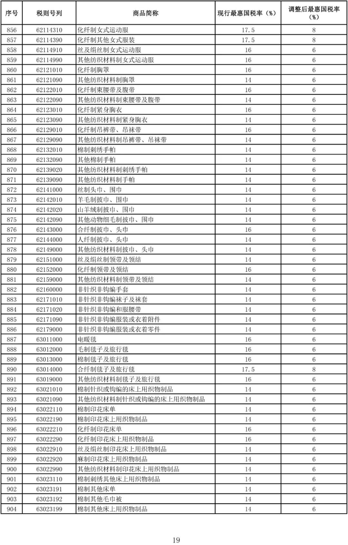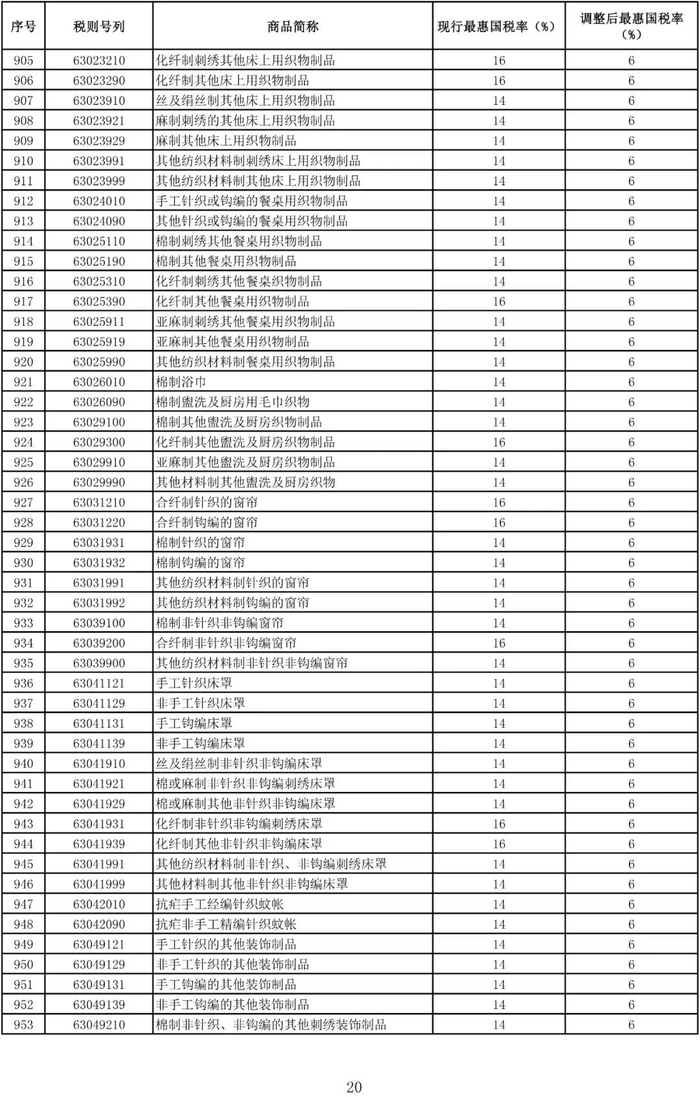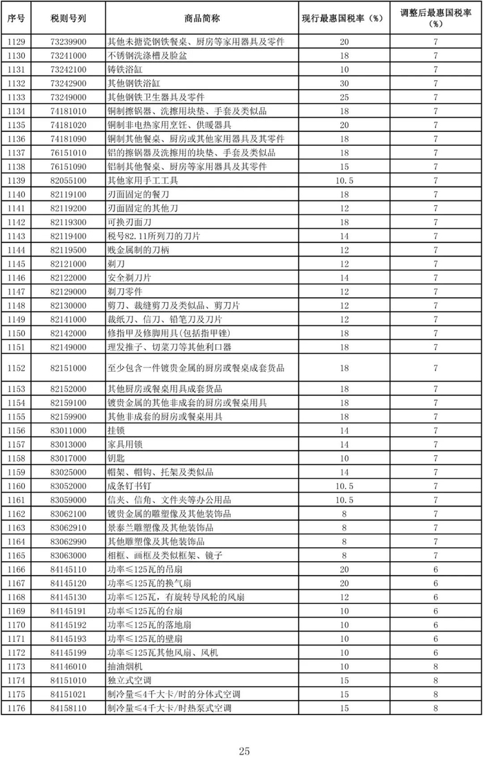 进口日用消费品最惠国税率调整表