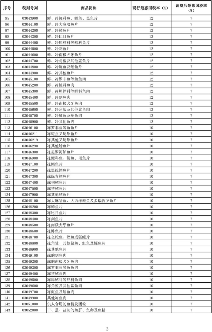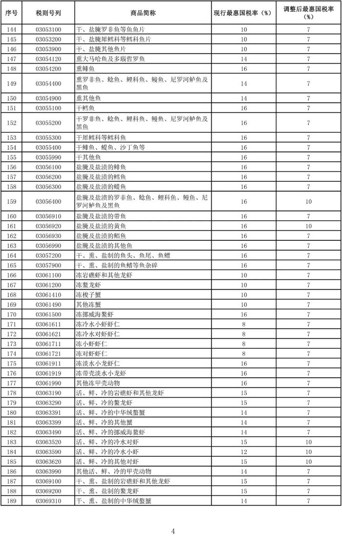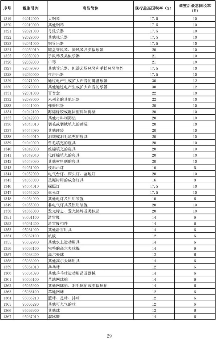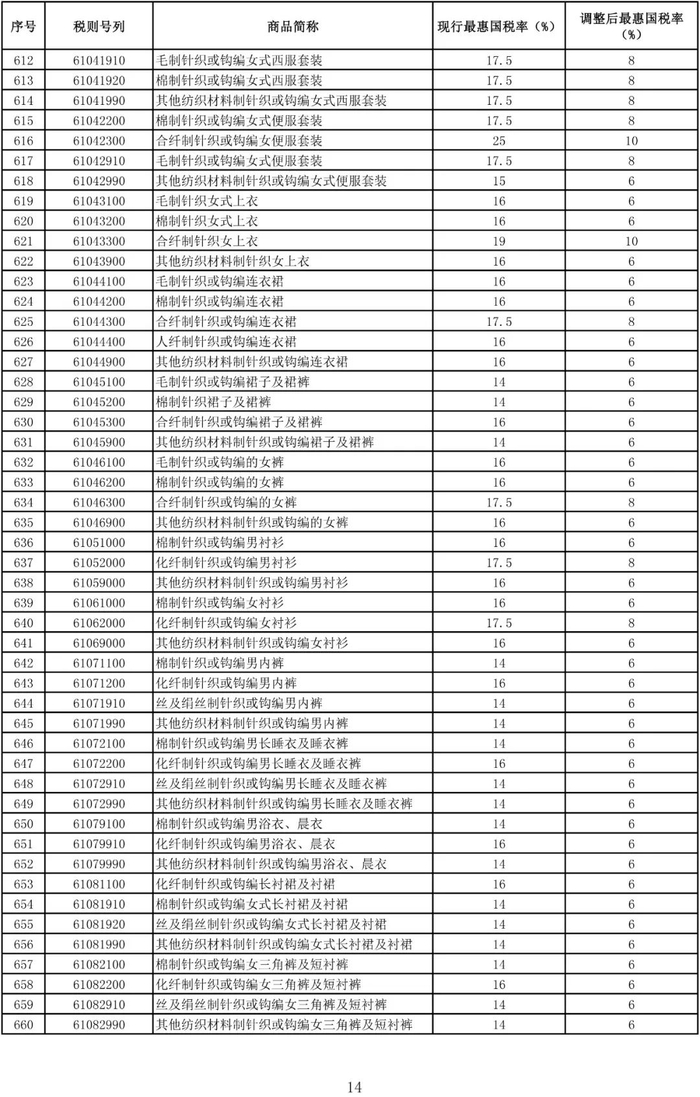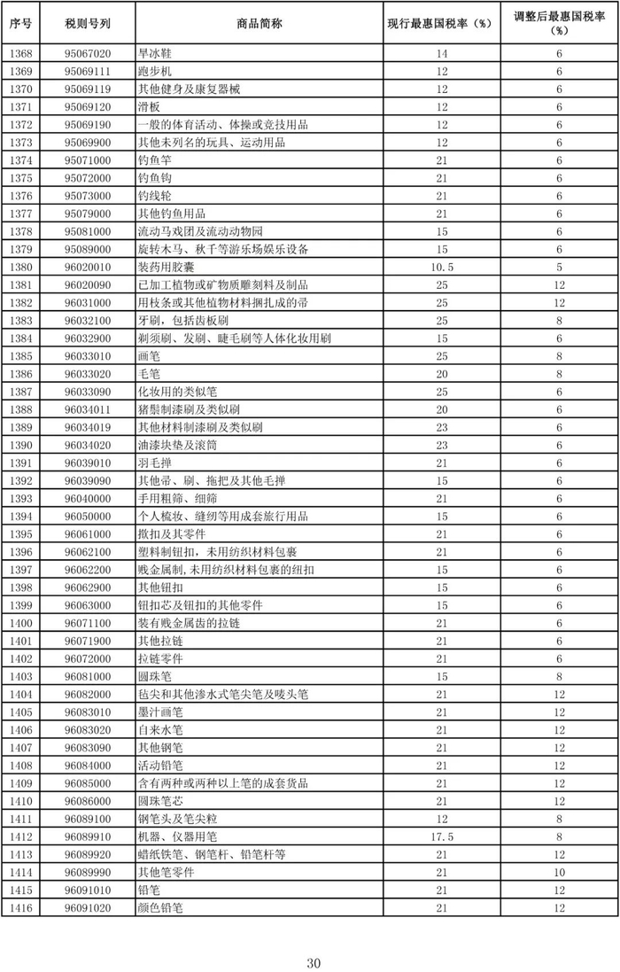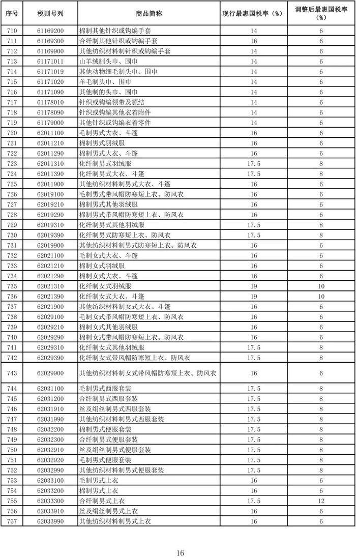 进口日用消费品最惠国税率调整表