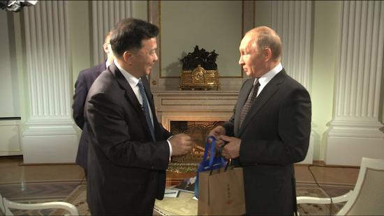 结束专访之际,慎海雄将家乡杭州的龙井茶赠送给普京总统,并祝普京履新成功精彩!祝中国之行顺利!祝俄罗斯世界杯圆满举办!