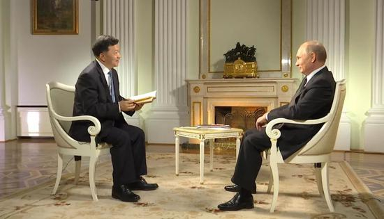 当地时间5月31日晚,在出席上海合作组织成员国元首理事会青岛峰会并对中国进行国事访问前夕,俄罗斯联邦总统普京在莫斯科克里姆林宫接受了中国中央广播电视总台台长慎海雄的独家专访。