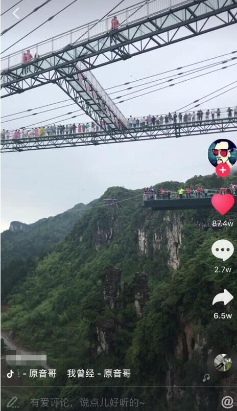 拍摄天空悬廊发抖音,可以拍天气,雨后,你能拍到雾气将吊桥包围,如同踩在云端上的仙境;可以拍惊吓的人,瘫软在桥面上抱着友人的大腿哭天抢地;可以拍脚下,修长的腿配上一段动感的音乐,脚步轻松的在全透明玻璃桥面上行走,抖友一定会为你的勇气点赞。