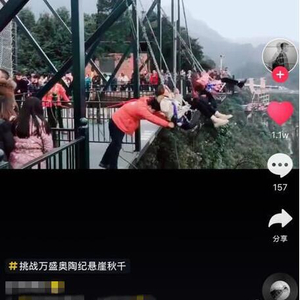 拍摄推手小哥有两个要点:一是要拍到推手身体重心随游客飞出悬崖外的瞬间,二是一定要配上游客杀猪般的尖叫声,如果能配上一段有意思的话,火的几率就更大了:“当初不顾家人反对修了这个悬崖秋千,如今没人敢推只能自己来推秋千,每天都要掉下去好几次,心好累,给个赞让我能坚持下去。”