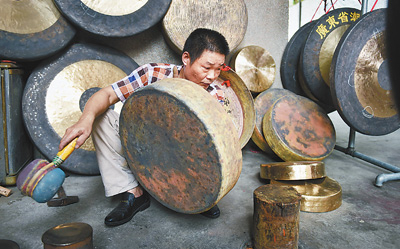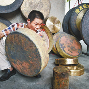潮州大锣鼓演出流行于广东潮汕地区,锣要经过择料、熔铜、过模、打坯、修容、淬火、定音7道工序,其中尤以定音技术性最强。这一工序必须举锤娴熟、轻重有数,特别是最后一锤,决定着铜锣的松紧度,定出不同的音阶音色,故有“千锤百炼,一锤定音”之说。