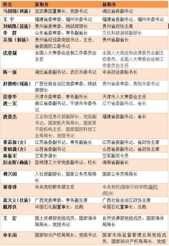 彭金辉和吴强均是少数民族干部。彭金辉是中国工程院院士,长期从事冶金新技术、资源综合利用等研究,此前任昆明理工大学校长一职。吴强曾任贵州省政府副秘书长,省经信委主任等职,他还曾挂职任上海世博会组委会交通协调保障组副组长。此外,山西政协副主席李晓波兼任山西省经信委主任,他此前是太原钢铁(集团)有限公司董事长。