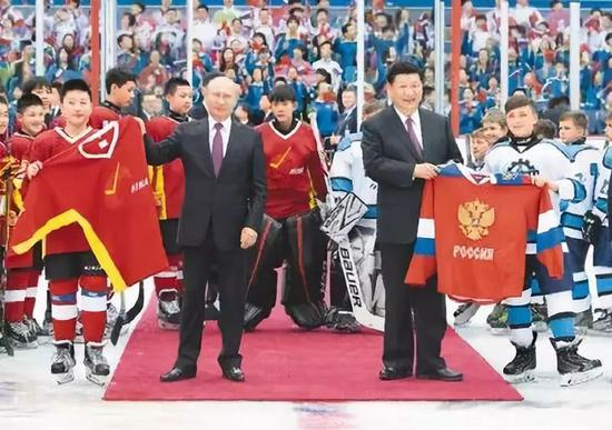 19时40分许,在欢快的乐曲声中,习近平同普京共同进入体育馆。天津体育馆内座无虚席,两国元首分别与两国小球员击拳问候、合影、亲切交谈,小球员们还分别向习近平和普京赠送了俄、中两队球衣。习近平和普京在冰场中圈共同为比赛开球,两国青少年球员为大家奉献了一场精彩的比赛。