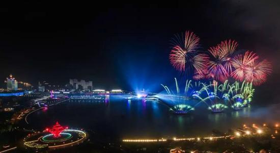 演出舞台搭建在大海之上,通过海上舞台多媒体球面视频、环幕投影于海岸线城市景观楼体相结合,创造性地将青岛的城市夜景融入舞台表演之中。