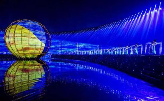 舞台台面铺满了水,表演会在水上进行,并跟水面做影像互动。水面上有一个地球仪形状的视频投影仪,投影仪背后是一个长达113米的环幕,这道环幕不仅要进行灯光秀,还会将幕后的海景和城市景观透视呈现出来。