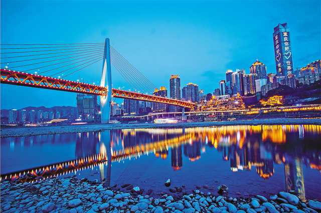 千厮门嘉陵江大桥和渝中区的高层建筑倒映在水面。(资料照片)记者 苏思 摄