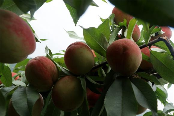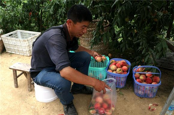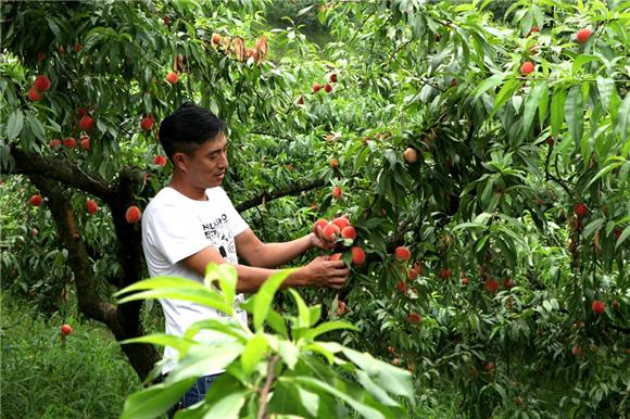 成熟的桃子分外诱人。通讯员 陶发明 摄祖文田今年48岁,是一个地地道道的农场主。他经营果园已经10多年,面积100亩,种植有李子、葡萄、桃子等果树。6年前,他成立了祖文田水果种植专业合作社,由于经营有方,成为当地有名的果农。他的合作社成为当地有名的水果种植示范基地,也成了在当地靠农家书屋学技术搞种植的典范。