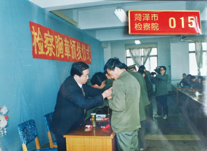 1996年9月,在干警胸章颁发仪式上,时任菏泽市检察院副检察长王显庚为干警颁发佩戴胸章。