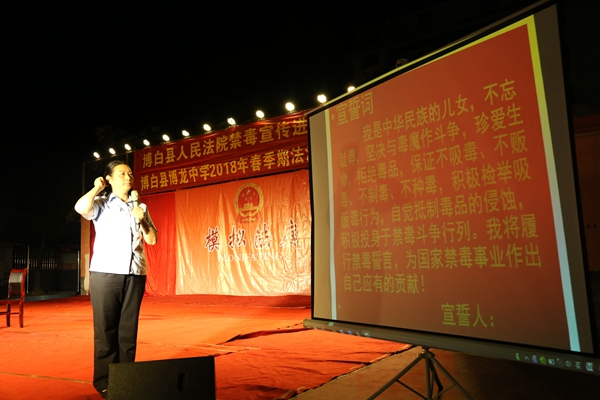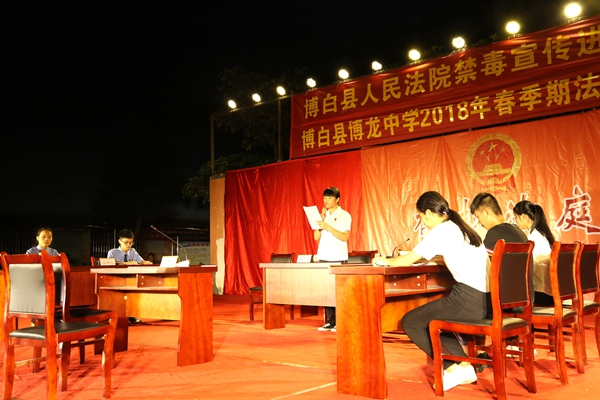 “我是中华民族的儿女,不忘耻辱,坚决与毒魔作斗争,珍爱生命,拒绝毒品……”在庄严的国旗下,博龙中学全校师生举起右手、面对国旗,进行“禁毒宣誓”,郑重承诺洁身自爱,绝不沾毒。6月12日,博白县人民法院家事与少年刑事审判庭、刑事审判庭的法官来到博白镇博龙中学开展模拟庭审进校园活动。