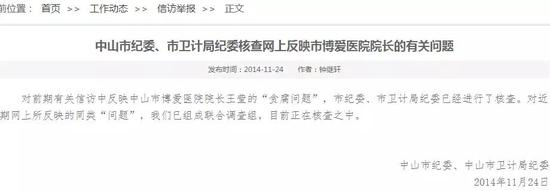2014年11月24日,中山市纪委发布消息:对前期有关信访中反映中山市博爱医院院长王莹的“贪腐问题”,市纪委、市卫计局纪委已经进行了核查。对近期网上所反映的同类“问题”,我们已组成联合调查组,目前正在核查之中。