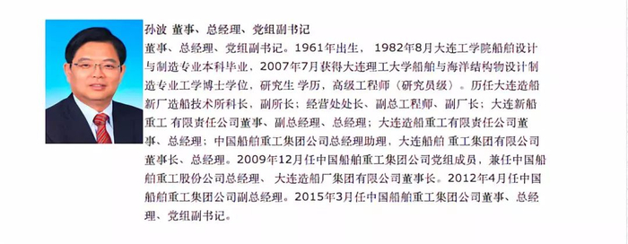 政知君注意到,在担任大连船舶重工集团有限公司董事长兼总经理时,孙波还曾被授予“辽宁省十大杰出青年企业家”、“大连市企业改革纪念章”等。