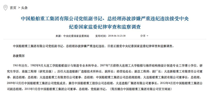 中国船舶重工集团有限公司党组副书记、总经理孙波涉嫌严重违纪违法,目前正接受中央纪委国家监委纪律审查和监察调查。