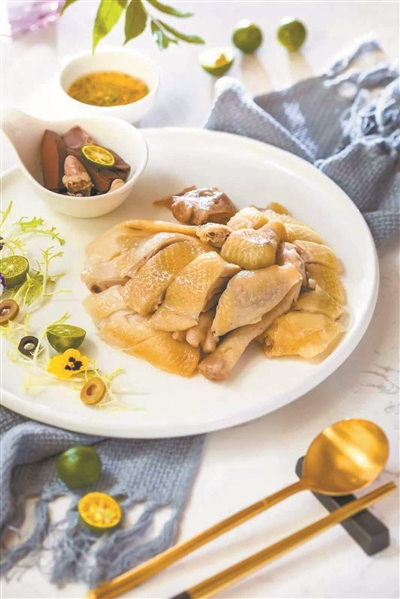 文昌鸡为第二宝,它因产于海南省文昌市而得名,据传其以榕树树籽为食,能有皮黄且脆,肉嫩且美,骨酥且鲜之功。食文昌鸡以白切为主,能够保留鸡身原有的风味,并辅以白醋、精盐、青橘汁、姜蓉和蒜泥配制成的调料。餐厅的文昌鸡用花生油和秘制调料腌制半小时,再隔水蒸。