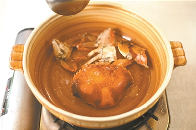 师傅说,海南有四大宝,一是产于万宁市和乐镇一带海中的海南和乐蟹,其膏满肉肥非常,为其他蟹种罕见,特别是其脂膏,金黄油亮,犹如咸蛋黄,香味扑鼻。一只和乐蟹足足有半斤重,从食材的筛选到食物的烹饪手法,师傅将蟹膏的鲜味融汇到和乐蟹粥中,平凡中方显细节。先用海南花生油洗锅,蟹切件后放入炒制,逼出蟹香味。炒好的蟹,与鸡汤、事先熬好的粥底一同在砂煲中煲到入味。