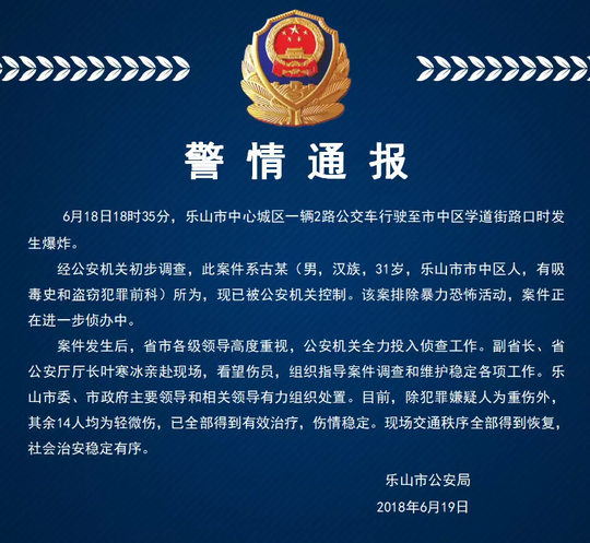 6月19日凌晨,乐山市公安局发布《警情通报》,对事件相关情况作了进一步通报。据通报,经公安机关初步调查,此案件系古某(男,汉族,31岁,乐山市市中区人,有吸毒史和盗窃犯罪前科)所为,古某现已被公安机关控制。该案排除暴力恐怖活动,案件正在进一步侦办之中。
